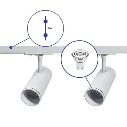 Complete Set 1-Fase Rail 1 Meter Wit | incl. 2x Spot + GU10 2700K 3W Dimbaar + Eindkap, Voedingsconnector