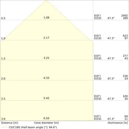 De gradenbundel geeft informatie over hoe breed het licht wordt uitgestraald. Dit zit tussen de 0 en 360 graden (D). Hoe kleiner de hoek, hoe specifieker de lichtbundel is. Over het algemeen is een smalle gradenbundel perfect voor sfeer- of accentverlichting, terwijl een brede gradenbundel ideaal is om grote oppervlaktes te verlichten.