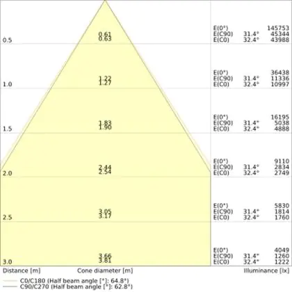 De gradenbundel geeft informatie over hoe breed het licht wordt uitgestraald. Dit zit tussen de 0 en 360 graden (D). Hoe kleiner de hoek, hoe specifieker de lichtbundel is. Over het algemeen is een smalle gradenbundel perfect voor sfeer- of accentverlichting, terwijl een brede gradenbundel ideaal is om grote oppervlaktes te verlichten.