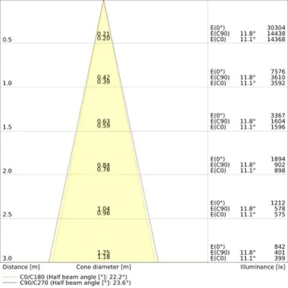 De gradenbundel geeft informatie over hoe breed het licht wordt uitgestraald. Dit zit tussen de 0 en 360 graden (D). Hoe kleiner de hoek, hoe specifieker de lichtbundel is. Over het algemeen is een smalle gradenbundel perfect voor sfeer- of accentverlichting, terwijl een brede gradenbundel ideaal is om grote oppervlaktes te verlichten.