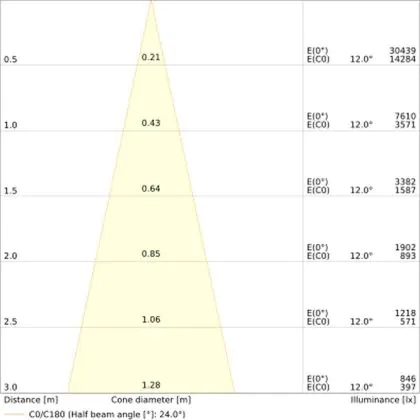 De gradenbundel geeft informatie over hoe breed het licht wordt uitgestraald. Dit zit tussen de 0 en 360 graden (D). Hoe kleiner de hoek, hoe specifieker de lichtbundel is. Over het algemeen is een smalle gradenbundel perfect voor sfeer- of accentverlichting, terwijl een brede gradenbundel ideaal is om grote oppervlaktes te verlichten.