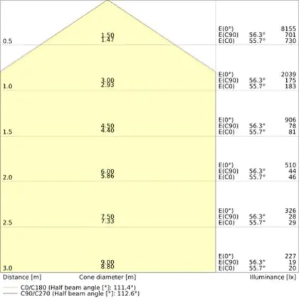 De lichtopbrengst (Lumen), geeft weer hoe krachtig het uitgestraalde licht is. Dit is belangrijk om te weten om de juiste sfeer te creëren. 0 tot 400 Lumen is bij uitstek geschikt voor accent- of sfeerverlichting. Een hoger aantal Lumen is, afhankelijk van de grootte van de ruimte, beter geschikt als ondersteunende- of basisverlichting. Heb je plafonds hoger dan 4 meter, dan is een lichtopbrengst van minimaal 8000lm aan te raden indien heldere verliching gewenst is (vb. in werkomgevingen).