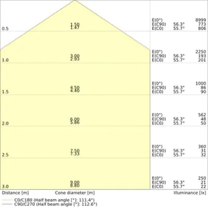 De lichtopbrengst (Lumen), geeft weer hoe krachtig het uitgestraalde licht is. Dit is belangrijk om te weten om de juiste sfeer te creëren. 0 tot 400 Lumen is bij uitstek geschikt voor accent- of sfeerverlichting. Een hoger aantal Lumen is, afhankelijk van de grootte van de ruimte, beter geschikt als ondersteunende- of basisverlichting. Heb je plafonds hoger dan 4 meter, dan is een lichtopbrengst van minimaal 8000lm aan te raden indien heldere verliching gewenst is (vb. in werkomgevingen).